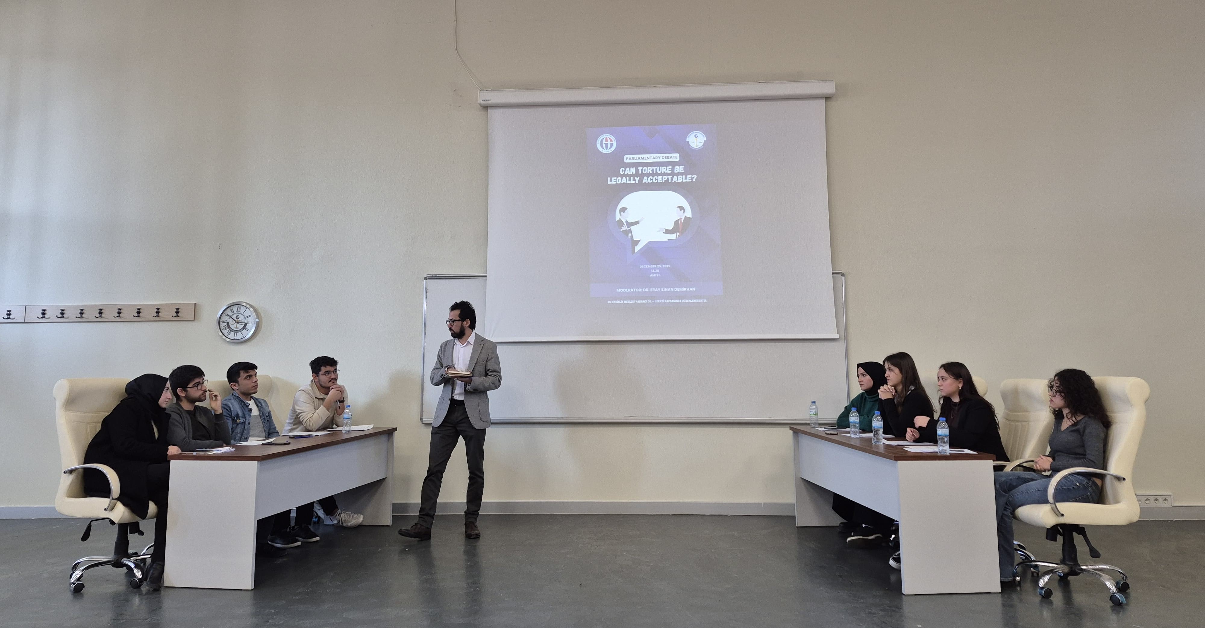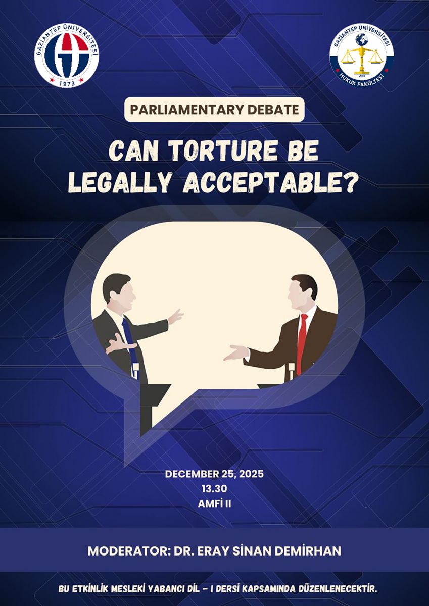 An English-language debate titled “Parliamentary Debate: Can Torture Legally Acceptable” was held on December 25, 2025, in Amphitheater III of our faculty, as part of the Professional Foreign Language - I course, moderated by Dr. Eray Sinan DEMİRHAN.
