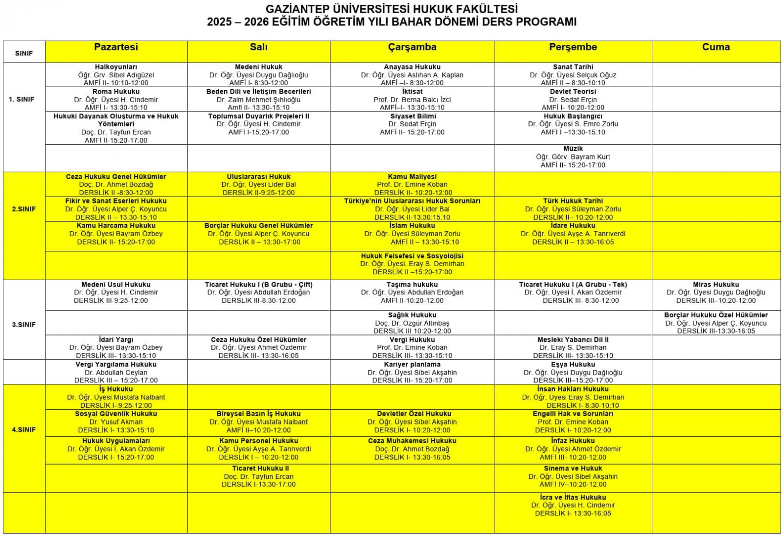 2025-2026 EĞİTİM ÖĞRETİM YILI BAHAR DÖNEMİ DERS PROGRAMI