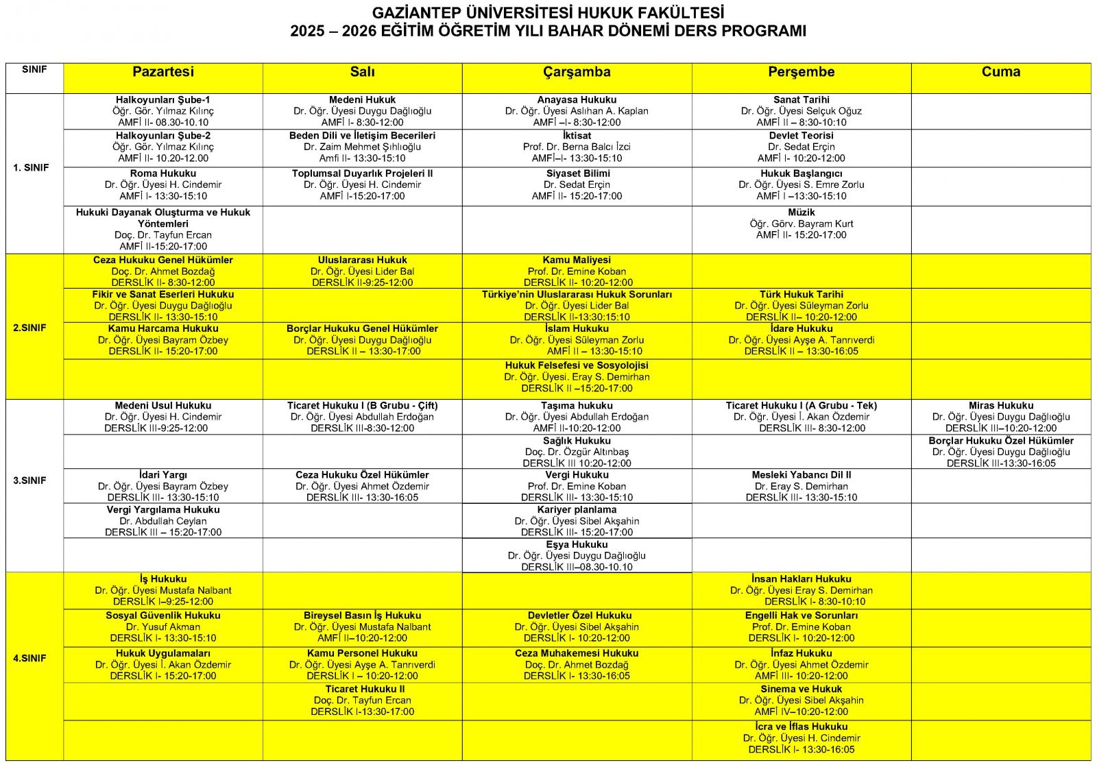 2025-2026 EĞİTİM ÖĞRETİM YILI BAHAR DÖNEMİ DERS PROGRAMI
